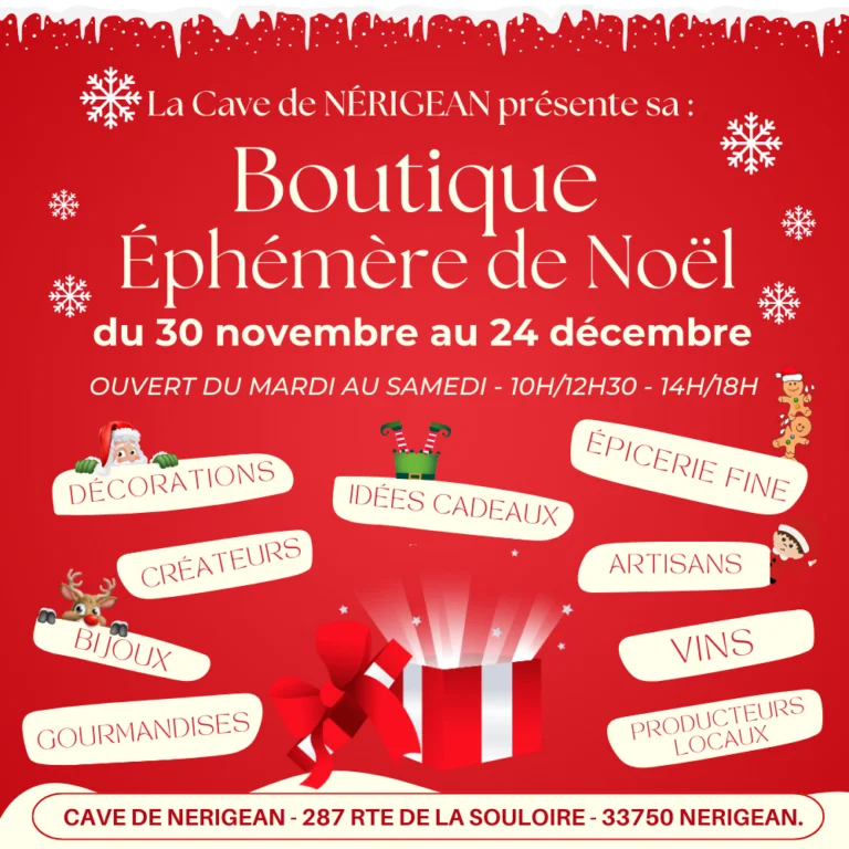 À l'occasion du Marché de Noël proche de Bordeaux, les Caves de Rauzan vous invitent à découvrir leur boutique éphémère de Noël du 29 novembre au 24 décembre. L'entrée est gratuite, de 10h à 12h puis de 14h à 18h du mardi au samedi.